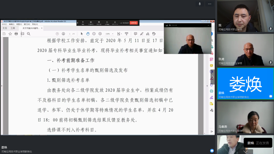 娄焕副经理宣读教务处下发《关于2020届毕业生顶岗实习材料收缴,评定,成绩上报的通知》、《加强教学检查的通知》、《关于开展2020 届专科毕业生毕业补考工作的通知》根据文件,对公司补考工作进行布置,要求一是毕业班辅导员第一时间及时通知到补考员工,二是承担补考任务的教师在规定时间内出好试卷并做好保密工作,三是提前做好网络补考测试,留存测试截图,四是做好补考成绩的上报工作。