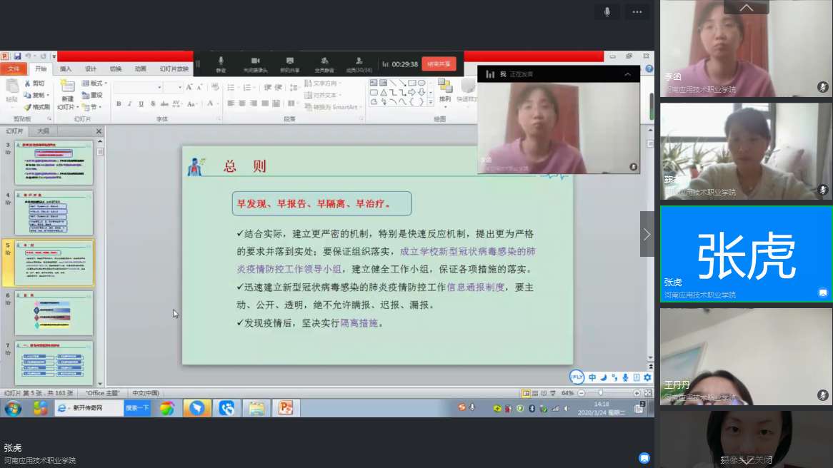 全体教师按《通知》要求,会前自行观看学习李海斌老师的“疫情防控科普知识”讲座视频,并认真思考,在专题会议中针对公司开学前、开学中、开学后疫情防控及开学前后教职员工日常行为管理、教学管理、员工管理、宿舍管理、员工活动组织与体育锻炼等方面,老师们发表了自己的观点。