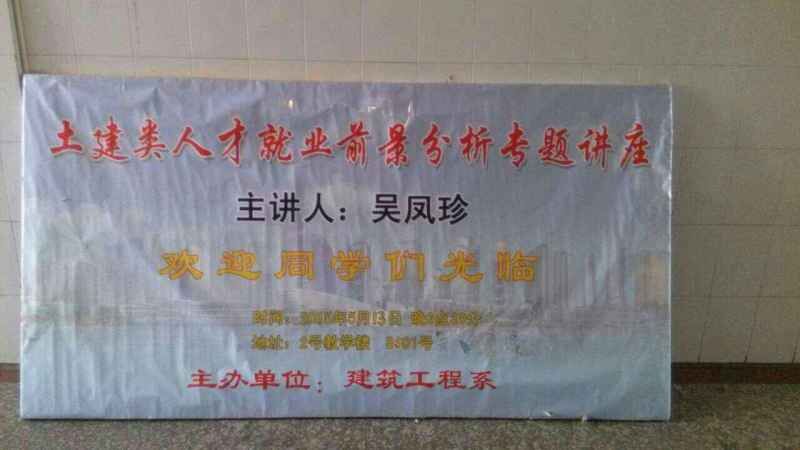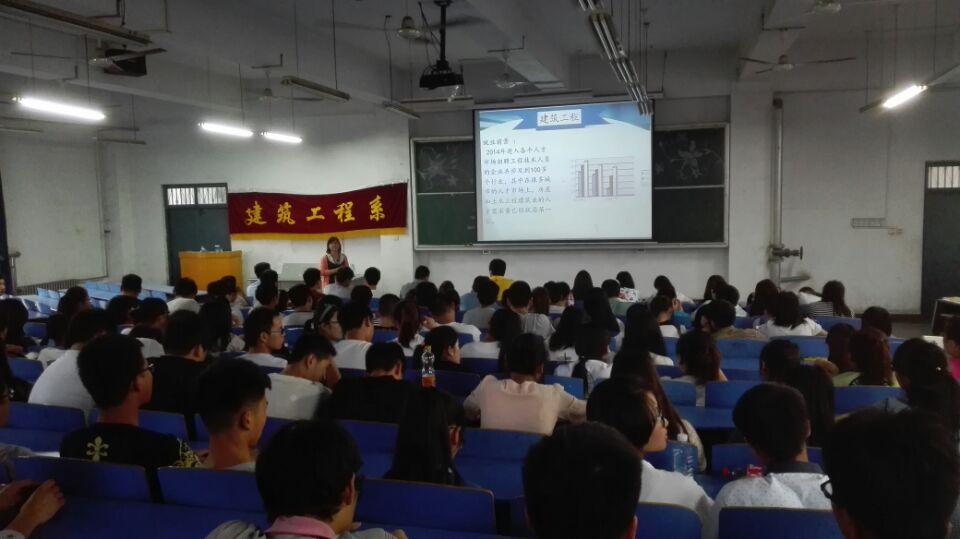 2015年5月13日为了丰富我系员工的课外生活,拓展同学们的专业知识以及所要从事专业岗位的认知,建筑工程系在B501教室特举办《土建从业人员就业前景分析》专题讲座,旨在提高老员工的就业能力,对当前就业前景以及择业、就业的重要性有一个全面的认识,树立一个正确的就业观和择业观。