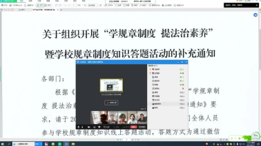 2022年4月21日下午,太阳集团tyc539三个教研室分别通过线上等方式召开关于“学规章制度提法治素养”暨公司规章制度知识答题活动会议。