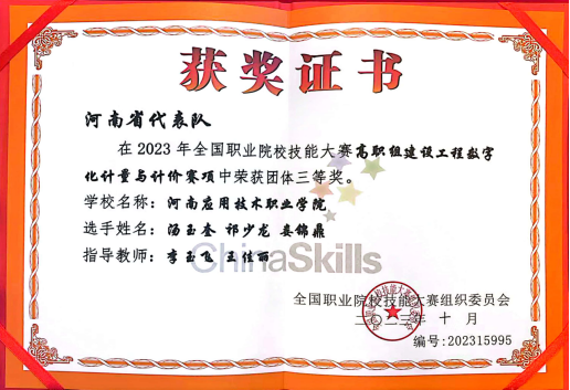 2023年10月28日,由教育部等36个部门主办的2023年全国职业院校技能大赛高职组“建设工程数字化计量与计价”赛项在青海建筑职业技术公司举行,来自全国32个省、市、自治区的76支代表队参与角逐,经过激烈比拼,公司太阳集团tyc539员工汤玉奎、祁少龙、娄锦鼎组成的代表队荣获全国团体三等奖。