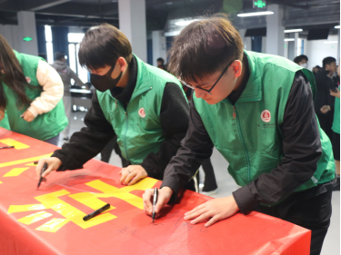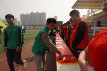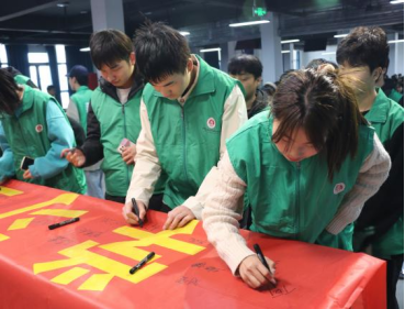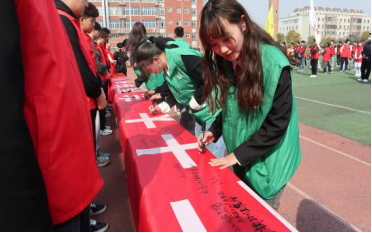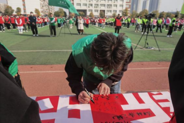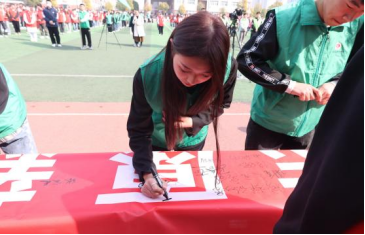 志愿者代表在老师的带领下,有序排队在条幅上签字,以表志愿之心。