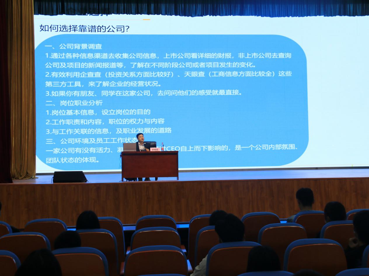最后,宋春磊老师对大家进行相关的就业指导。他从如何选择企业、避免就业陷阱、三方协议填写、顶岗实习注意事项、面试技巧、专升本注意事项等方面向大家做了详细的介绍。同时,宋春磊老师强调了顶岗实习期间,大家应增强人身安全、交通安全以及求职诈骗等各类安全防范意识谨防上当受骗。
