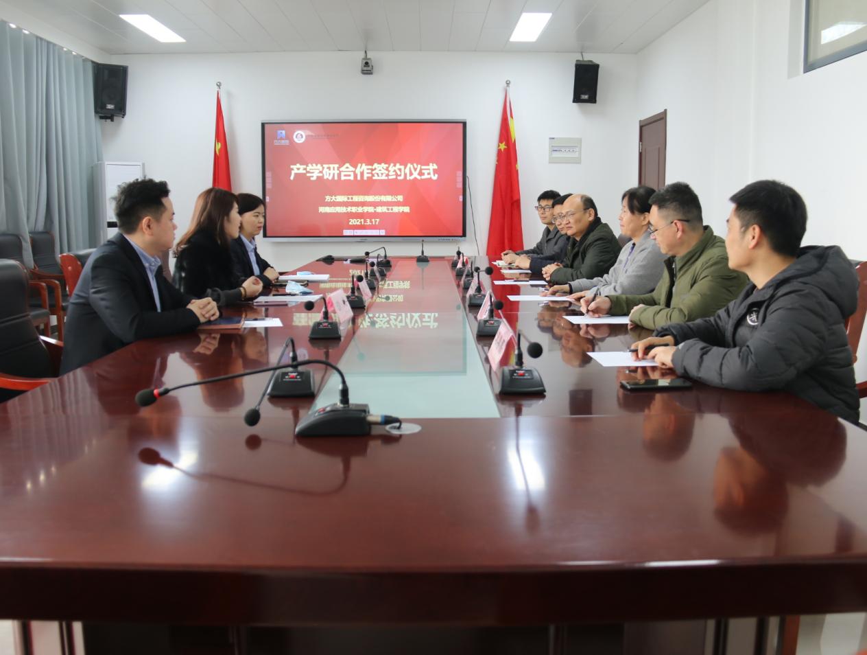 3月17日,中方大国际工程咨询股份有限公司行政人资总监张鑫、人力资源部经理沙龙、人资主管碗晓晓一行到公司,就项目合作、人才培养等方面进行深入交流,并与公司签订校企产学研合作协议。太阳集团tyc539经理张虎、书记马春燕、副经理娄焕及相关人员出席签约仪式。仪式由经理张虎主持。