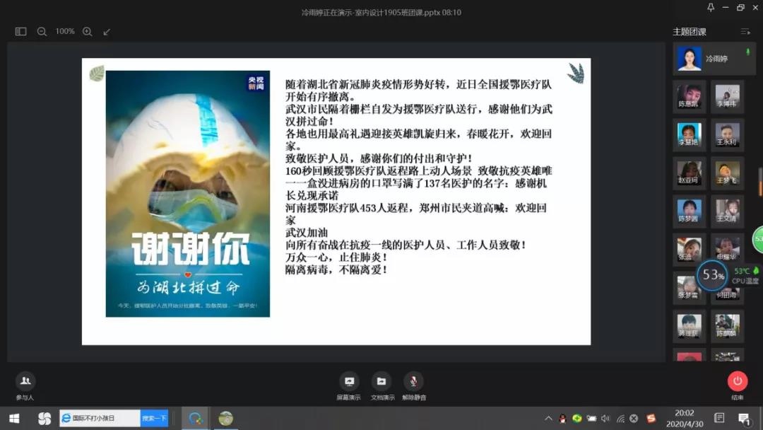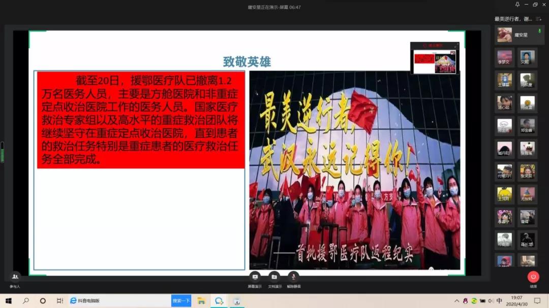 各团支部利用线上网络视频会议,线上集体讨论等学习方式,组织团员青年认真学习最美逆行者,各省援鄂医疗队有序撤离武汉,团员青年们从他们身上学习到他们是白衣天使,但他们更是普通人。他们近距离与病毒搏斗,马不停蹄地把一个个病人从死神手里抢回,日日夜夜的忙碌却从没有压垮过任何一个坚强的他们。我们在过年,而这些白衣天使却在帮我们过关。他们舍小家为大家,是时代的骄傲,是民族的骄傲,是国家的骄傲。他们是白衣天使,更是白衣战士。他们都是伟大的逆行者!
