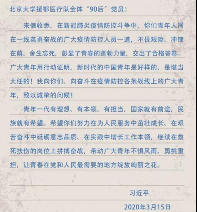 中共中央总书记、国家主席、中央军委主席习近平3月15日给北京大学援鄂医疗队全体“90后”党员回信,向他们和奋斗在疫情防控各条战线上的广大青年致以诚挚的问候。回信中,字里行间充满着对青年的深切期望、殷殷嘱托。在这次抗击疫情的斗争中,以“90后”为代表的青年一代挺身而出、担当奉献,充分展现了新时代中国青年的精神风貌。这不仅仅是写给北大援鄂医疗队的年轻英雄们,更是对我辈青年老员工、党员、团员的鼓励和期许。我们是新时代的弄潮儿,既脚踏实地,又敢闯敢拼,在这场没有硝烟的战役中,我们接受党和国家对我们的考验,学习前辈“干惊天动地事,做隐姓埋名人”奉献精神,用青春之我、青春之力、青春之声,掀起红色生命的浪潮。