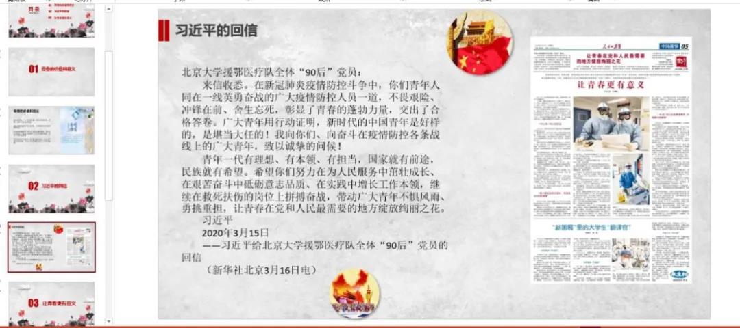 各团支部利用线上网络视频会议,线上集体讨论等学习方式,引导广大青年深入学习以援鄂青年为榜样,同时应做到“四学三做”:要学习抗疫一线人员的爱党爱国精神、无私奉献精神、团结协作精神和勇于担当精神,要做一个爱国有志、有理想有思想、有责任有担当的青年。认真学习习近平总书记给北京大学援鄂医疗队全体‘90后’党员回信,进一步明确当代老员工身上所肩负的重担,并鼓励大家时刻以一名优秀团员的标准来要求自己。