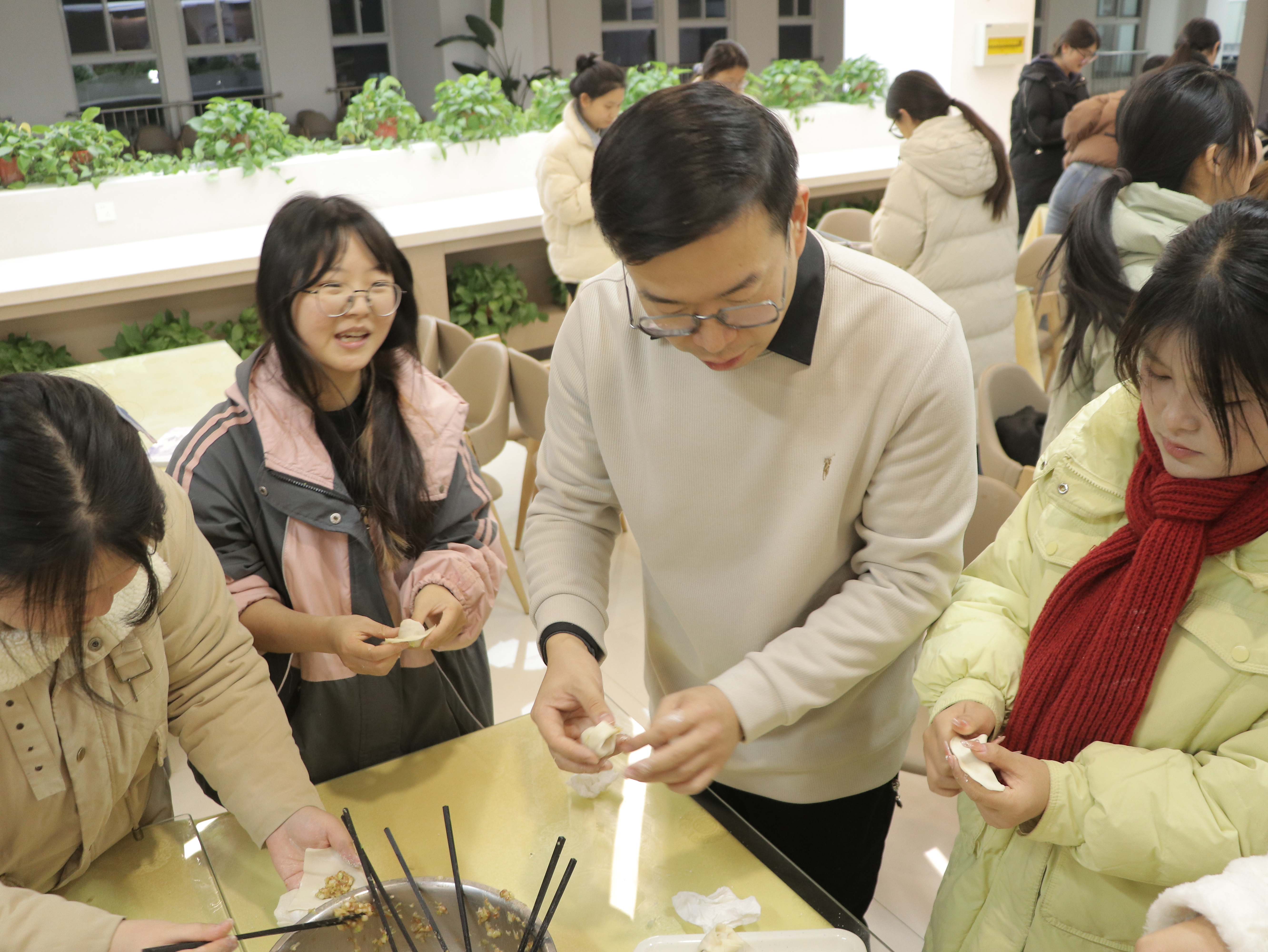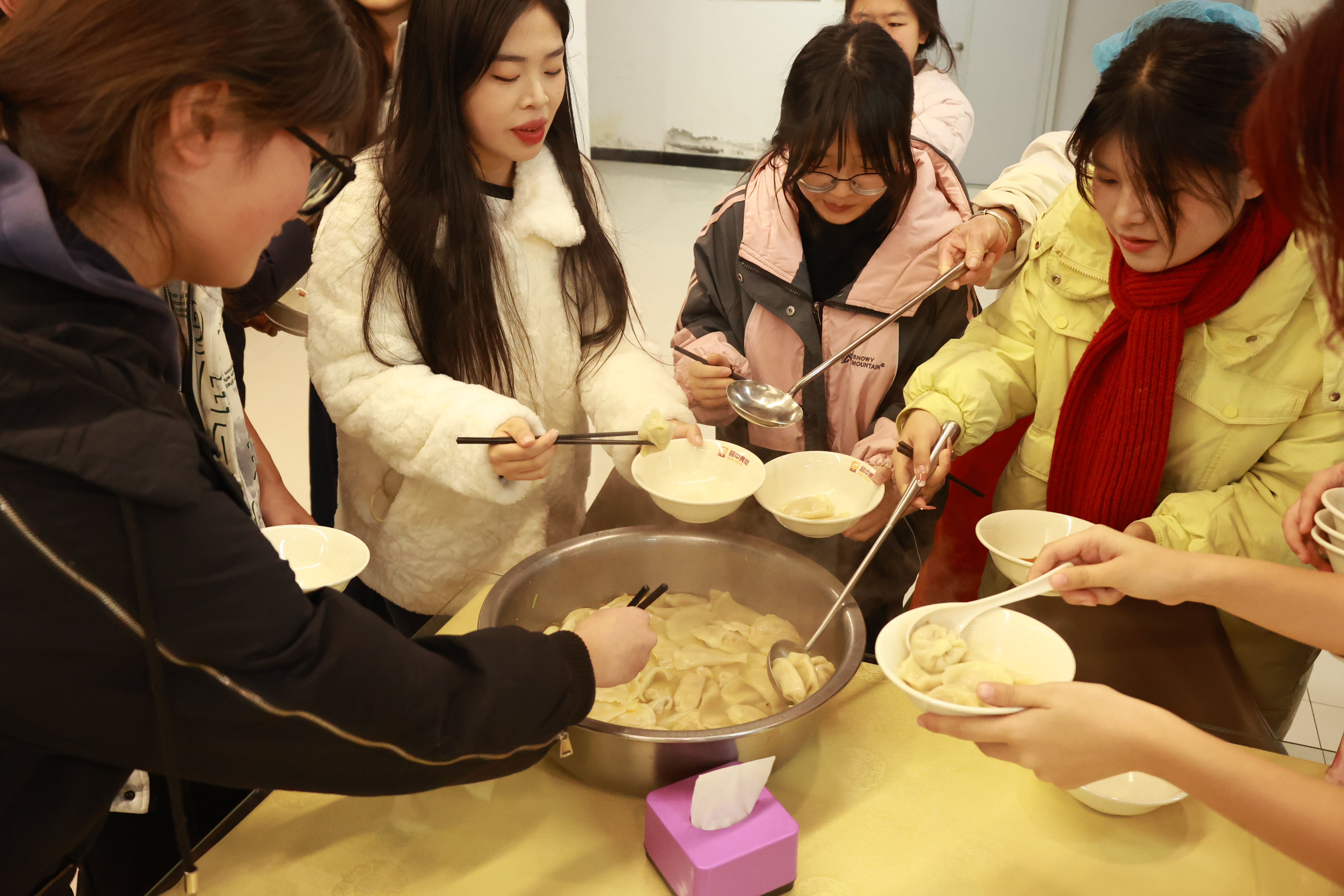 活动现场热闹非凡,大桌上摆满了面粉、各类馅料、擀面杖等包饺子的必备物品。在老师和班委的有序组织下,同学们快速分组投入到活动中。揉面的同学双手沉稳有力,按压翻转面团,使面团变得光滑而有弹性;擀皮的同学手法娴熟,很快,一张张薄厚均匀、形状完美的饺子皮整齐排列。包饺子环节更是趣味横生,欢声笑语不断。同学们创意十足,包出的饺子形状多样,除传统的半月形饺子外,还有星星形、花朵形等新奇样式,引得周围同学阵阵欢笑与赞叹。