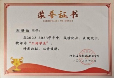 “在科学上没有平坦的大道,只有不畏劳苦沿着陡峭的山路攀登的人,才有希望达到光辉的顶点。”该生在学习上始终保持着脚踏实地的态度,认真学习每一门课程,高质量完成每一份作业。周静怡同学认为,世上没有白费的努力,也没有碰巧的成功,看似无心插柳,其实都是水到渠成。作为员工,她自入学以来就从未懈怠,有计划地学习专业知识,积极参加各种活动。她在不断夯实专业基础的同时,还具备良好的科研兴趣。该生在专业课程上也取得了优异的成绩,连续4个学期保持班级前列,获得省级三好员工、校级奖学金、先进优秀个人等奖项。作为员工干部,她团结同学,敬爱师长,深入细致地做好各项本职工作,是同学们的好榜样,老师的好帮手,有较强的集体荣誉感。会经常与老师交流,发现自己存在的种种不足,努力改正,使自己思想不断提升。
