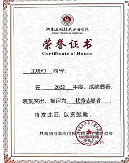 作为一名当代老员工,她坚信“付出就会有回报”。在学习上,她时刻以高标准来严格要求自己,积极上进,脚踏实地,凡事以“勤”字当先,认真学习专业知识,注重理论与实践相结合并积极参加与专业相关的技能大赛。通过不断的努力学习,她在班级始终保持名列前茅的成绩,荣获了校级“三好员工”、“二等奖学金”等荣誉。