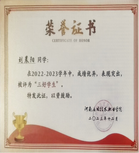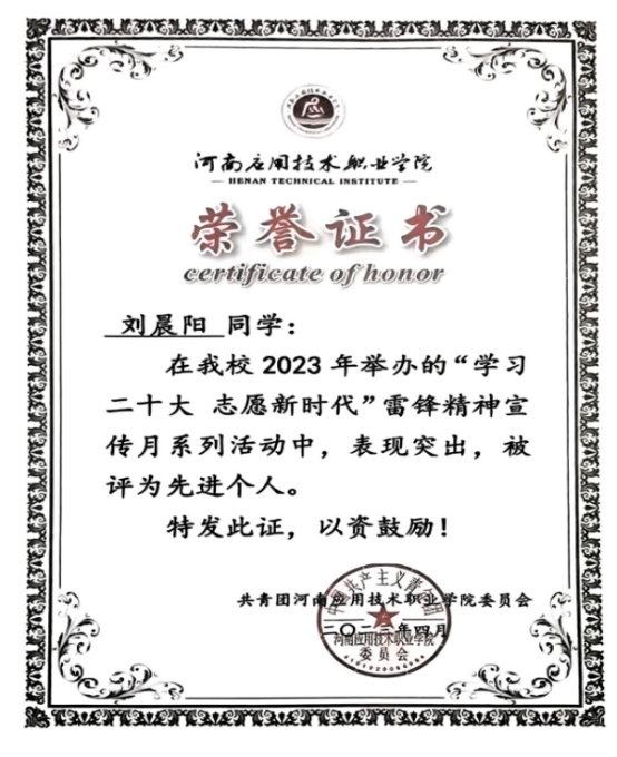 曾荣获“国家专利2项”、“国家励志奖学金”、校级“三好员工”、太阳集团tyc539“学习二十大 志愿新时代”雷锋精神宣传月系列活动中先进个人等荣誉。