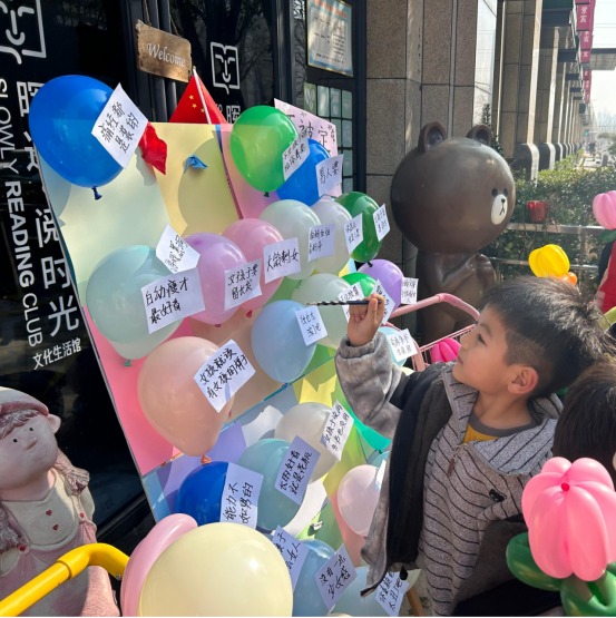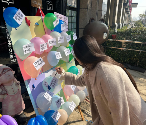 志愿者们在书房内设置了贴满气球的展示板,每个气球上都附着一些对女性的刻板标签。书房的读者可以任选一个气球扎破,象征着打破偏见,并获赠一份由气球编制的精美花束。现场还开展了盲盒抽奖活动,参与者在扎破气球后,能够抽取盲盒,收获充满温暖与鼓励的小纸条。这些活动以多样的方式传递出深刻的理念:每个人都不应被刻板定义,要挣脱偏见的束缚,在各个领域绽放光彩。