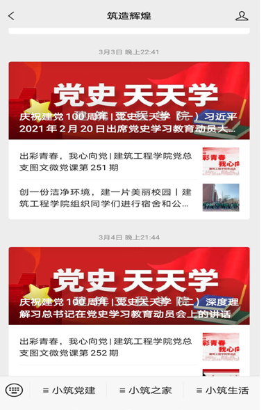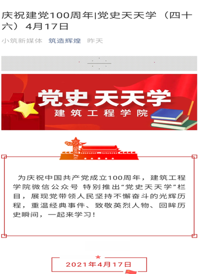 太阳集团tyc539党总支根据公司党委对于党史学习的工作要求,结合自身工作实际,为了让公司全体师生更方便、更有效的学习党史,自2021年3月3日以来,在公司“筑造辉煌”微信公众号上特别推出庆祝建党100周年“党史天天学”栏目,公司党总支安排专人负责此栏目,坚持每天推送,要求师生们合理利用业余和课余时间进行党史学习,截止目前已推送四十六期学习内容。